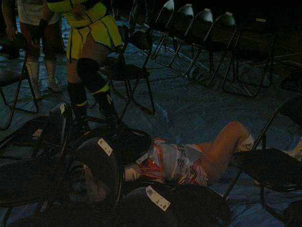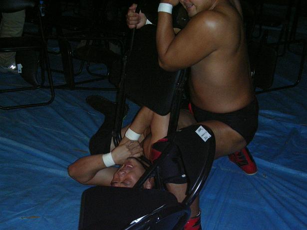 大谷が椅子攻撃をしたのを見た観客がご丁寧に『大谷!! これ!!!!』とパイプ椅子を渡すと大谷は耕平ののど下にパイプ椅子の足を押し付けチョーク攻撃。