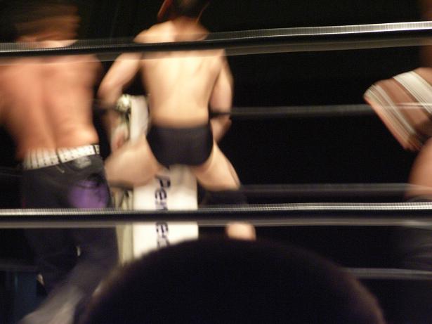 で、試合はまたも乱戦となり自分の近くでは大森と村上が乱闘していたところを神風がコリノをトコジョーズで3カウント奪取。