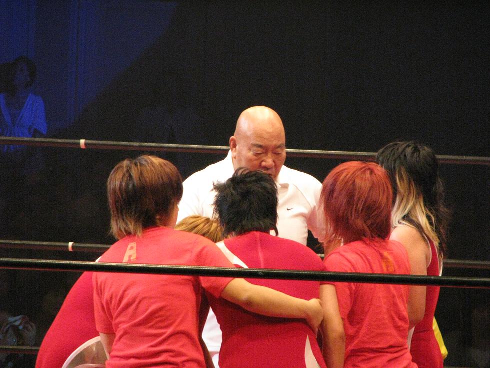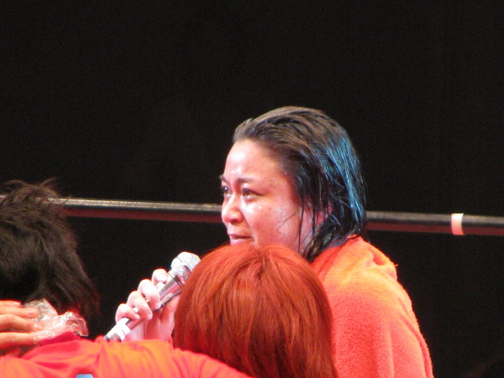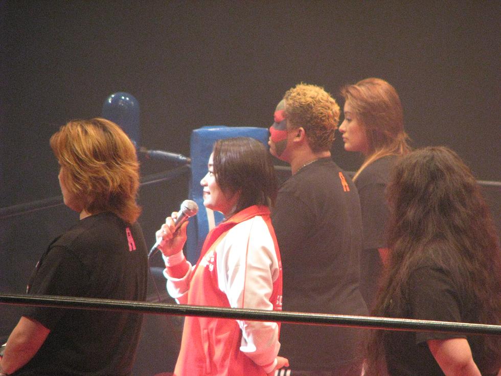 仙女以外の選手達が下がった後で、里村が締めのマイク。