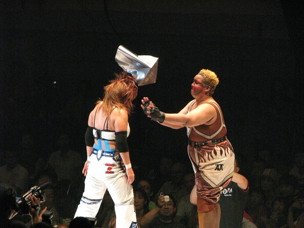 対するアジャ、リングインと同時に文子に一斗缶攻撃。