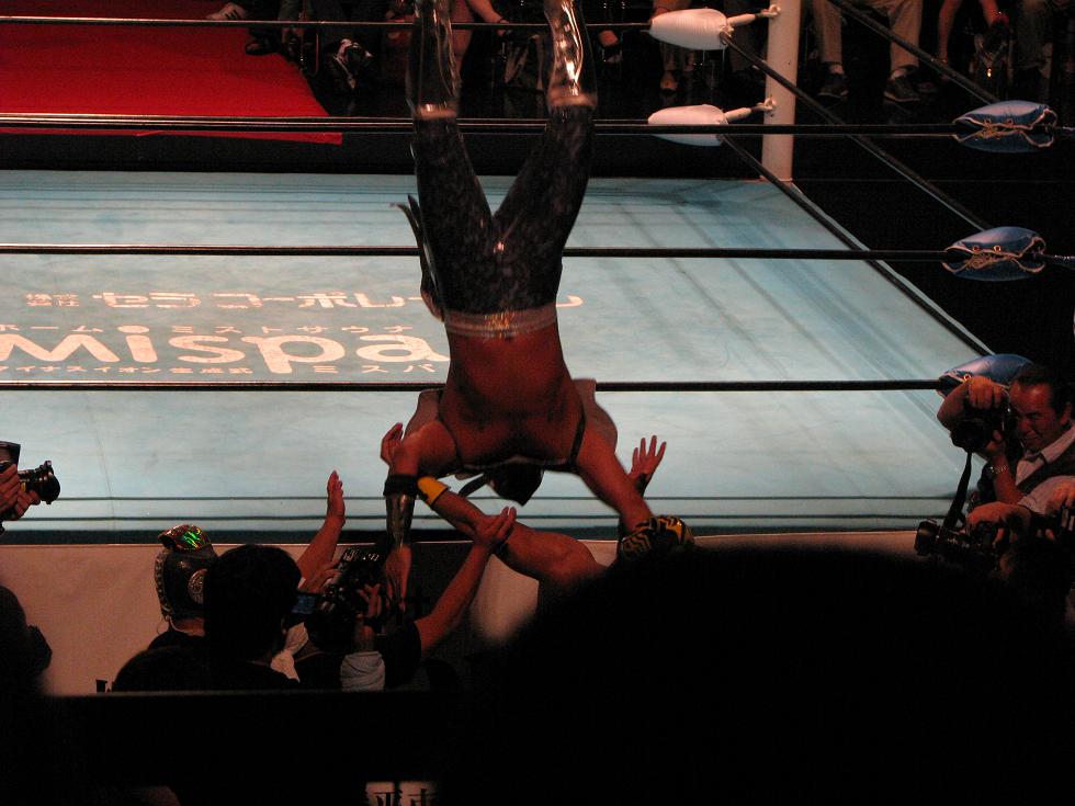 ここからリング下にライガーを落としてトペ・コンヒーロ、更にサスケ・スペシャル2を見舞い、ライガーは場外でダウン。