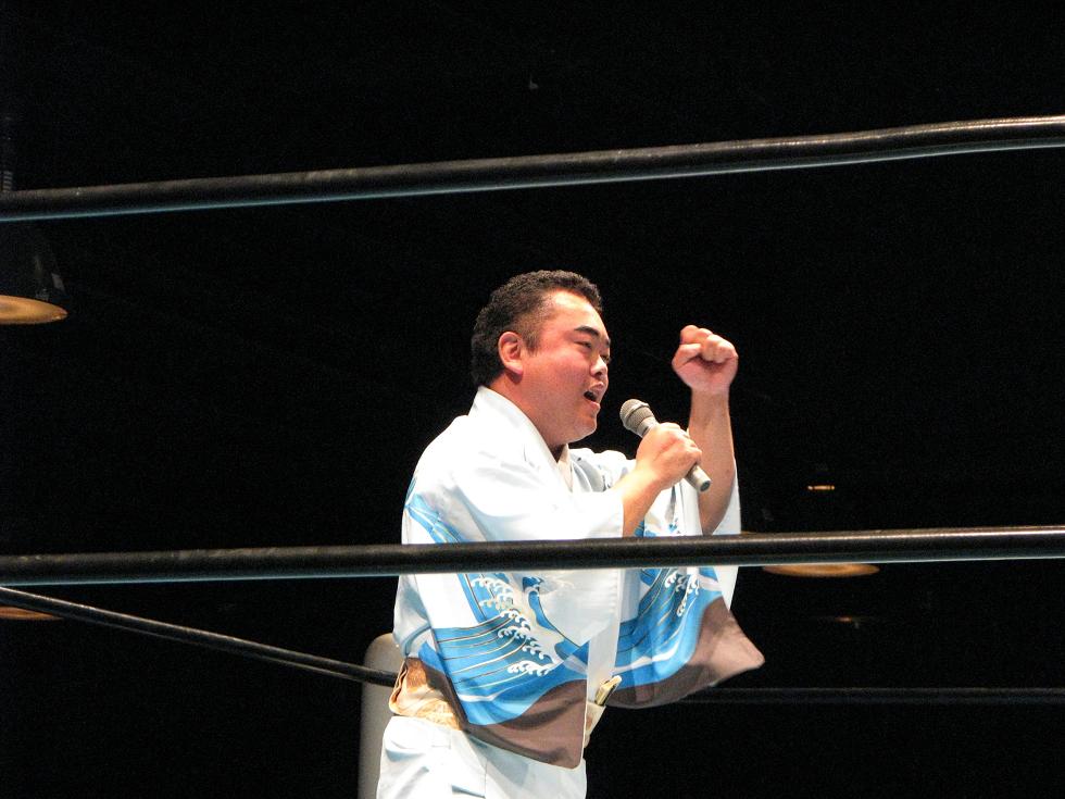 そうこうしていると、サスケ会長がリング上で欠場の挨拶。