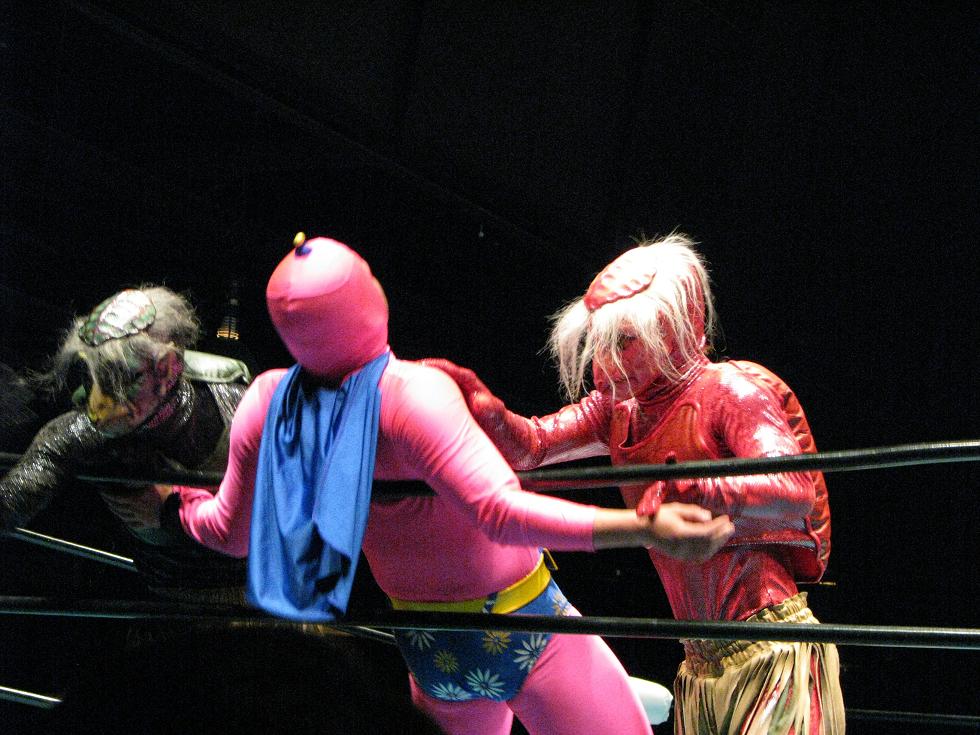 で、沼二郎先生とハッピーマンが入場してきて、河童側についたカラスコに切れて沼二郎先生はカラスコのマスク(ザ・グレート・カラスコのマスク)没収。