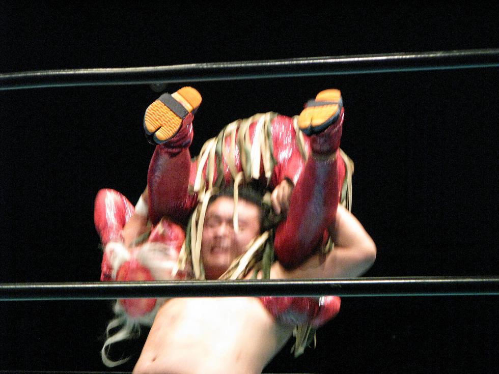 人生社長は社長業が忙しいのにちゃんと練習しているようでここぞとばかりに念仏パワーボムをコーナーに向かってラッセ、景虎に放ち、大金剛輪陀羅尼。