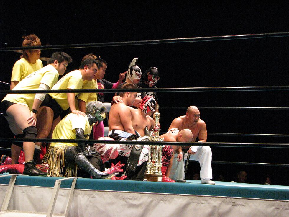 ラストはラッセと景虎が二人でベルトとトロフィーを掲げ、みちのくプロレスのテーマが流れて終了。