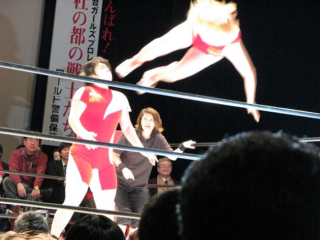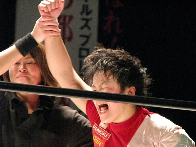 試合はちょっと微妙な感じだったが、最後は水波が三角締めでチサコから勝利を奪う。
