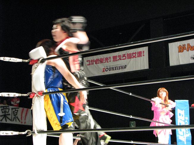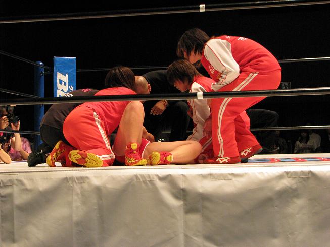 さて、そんな感じで試合なんだけど、伊東レフェリーの怪しい判定などがあってなんだかあれな感じだったが、幸子がジャーマンで美央から勝利。