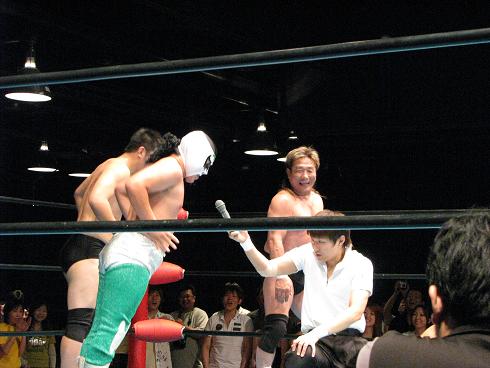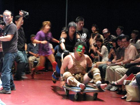 試合後、ヨネ原人を代車に乗せて佐藤兄弟がリング周りを一周し、西側観客席にそのままスロー。