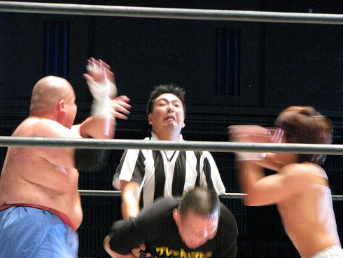で、結局レフェリーも敵もタッグパートナーも全員投げ飛ばした小鹿社長が佐藤きゅんからアイアンクローで勝利。