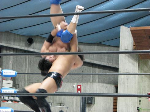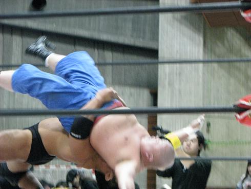最後は変形のフィッシャーマンズ・スープレックスで豪が勝利。