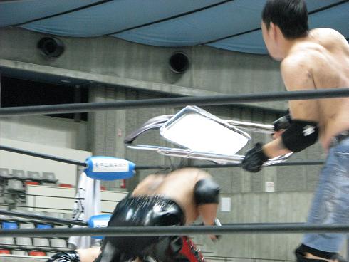 で、忍の誤爆ぐらいから暴走しはじめたMASADAはパイプ椅子で全選手を攻撃。