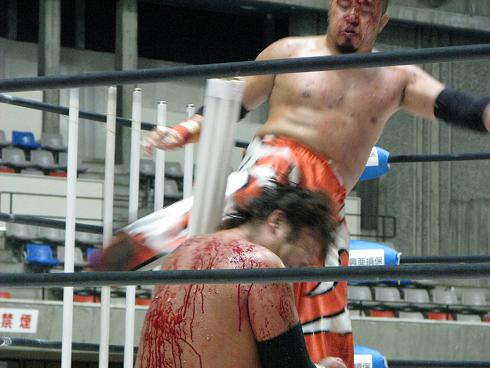 で、気付くとリング上に主戦場が映り、あんまりハードコアらしい感じの試合じゃなくなり、Ken45°が伊東のドラゴンスプラッシュを食らって敗北。