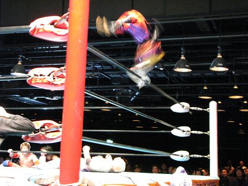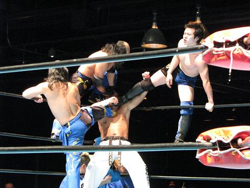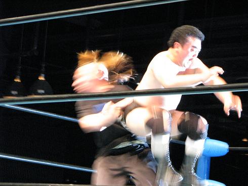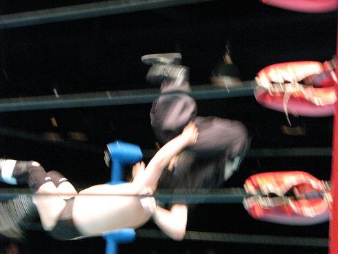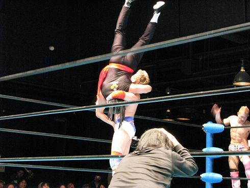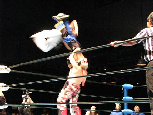 忍のラ・ケブラーダとか義経のノータッチ・トペコンヒーロとか、凄い技もたくさんあったし、姐さんの2度失敗しながらも三度目にしっかり決めるミラクル・エクスタシーみたいな業の成功へのプロセスを見せる感じの技等色々あったんだけど、ちょっとインパクトが弱いと。