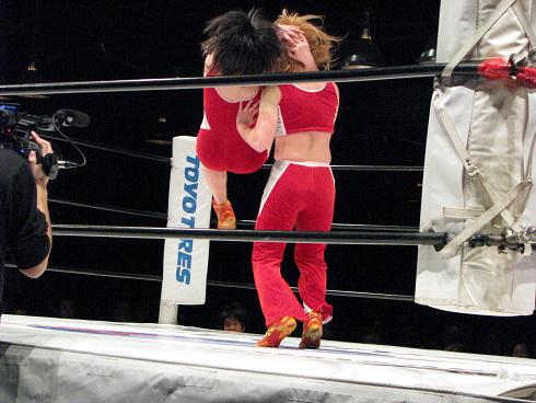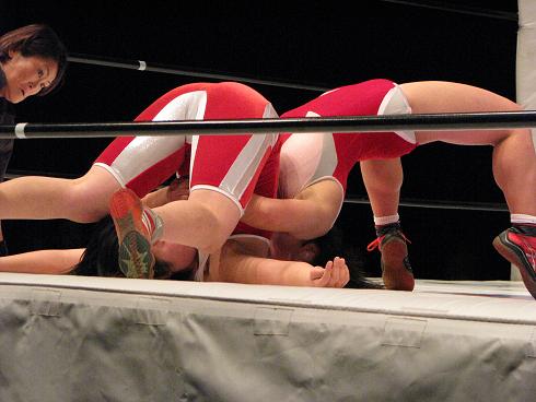 そういった攻防の中で悲恋がアンクルで攻めると水波が掟破りの逆アンクル(ていうか、正直裏アキレスにしか見えなかったが)で会場盛り上がる。