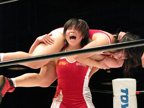 水波は自分のパワーを活かした攻撃で里村を攻める。