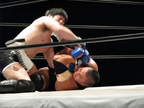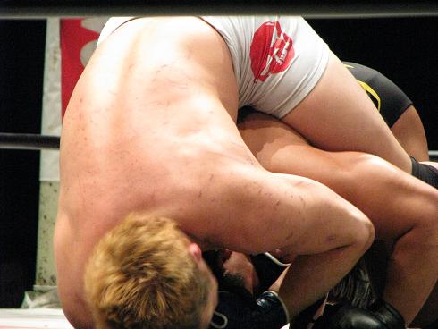 んで、試合なんだけど、一昨年のGWに見たものと同じルールでオープンフィンガーグローブつけたロープブレイクありの半端なMMA。