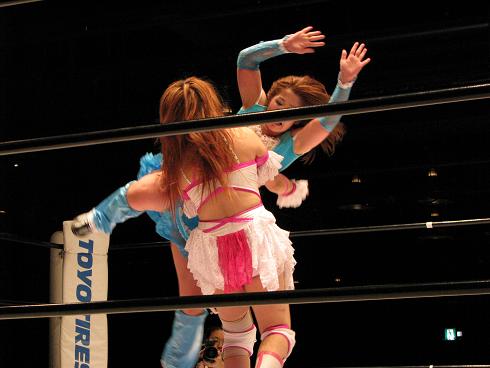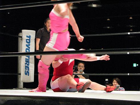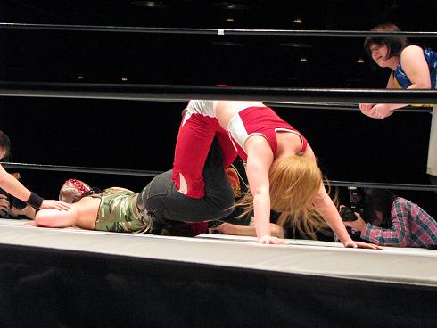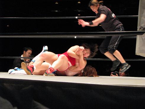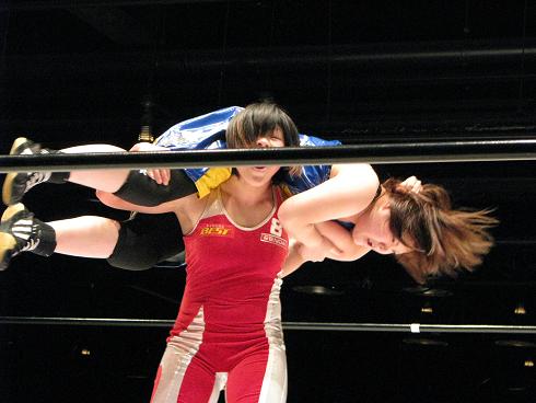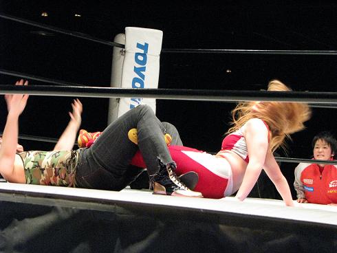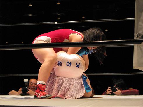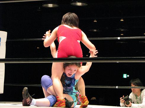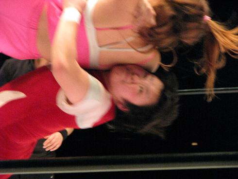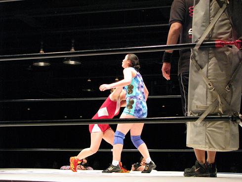 エスイがアトミックドロップを狙うとチサコはRKOで迎撃しようとするが、一度は型が崩れてしまう。