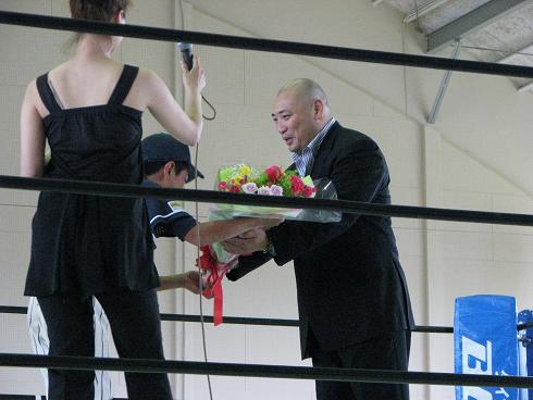 両者リングイン後、水波へ地元スポーツ少年団から花束贈呈。
