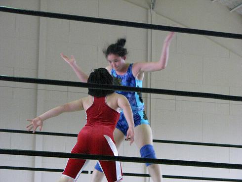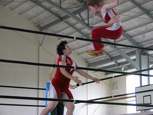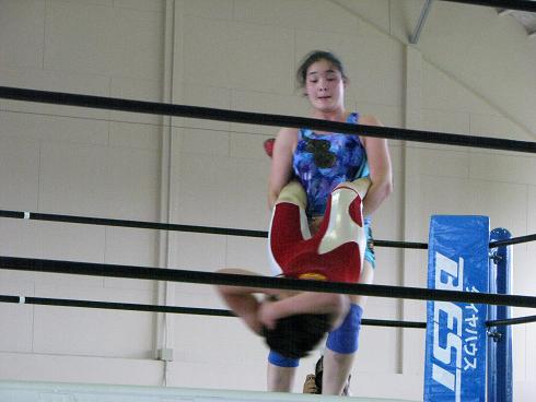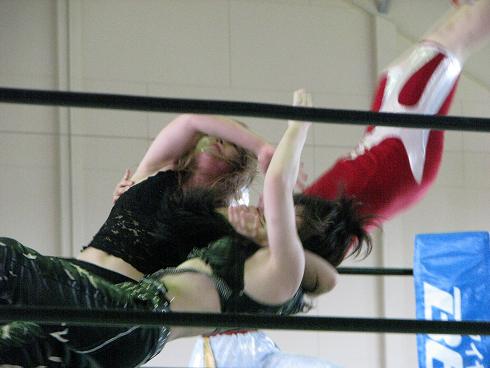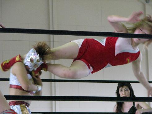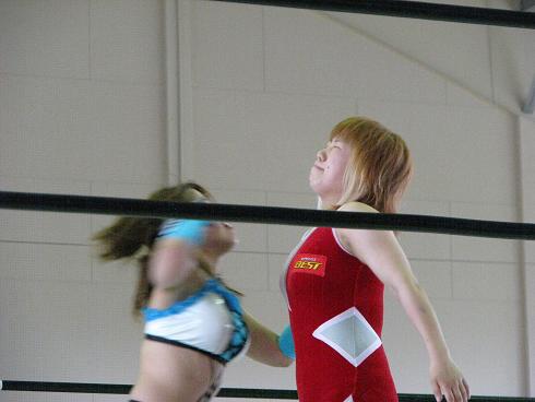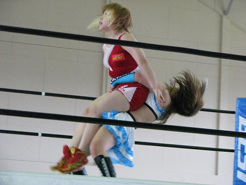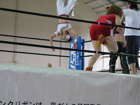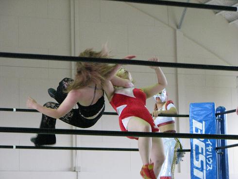 チサコのダイビング。フットスタンプが外れたのは困ったが、水波が悲恋を捕らえて裏投げ。