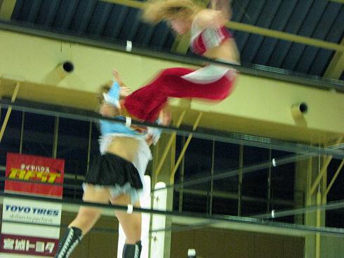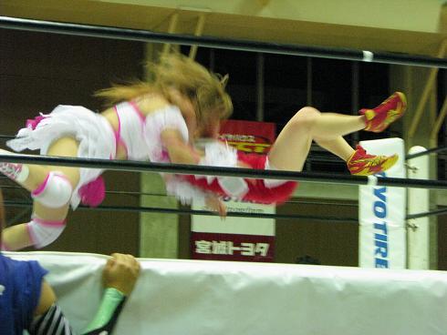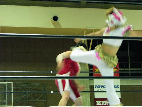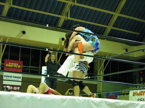 で、対するチサコはやっぱりドロップキック、スタナーなどで対応。