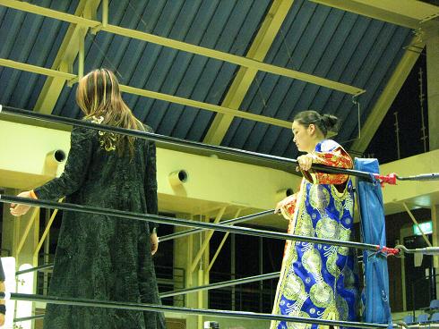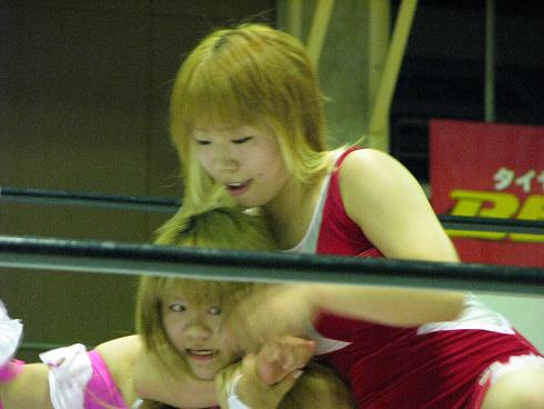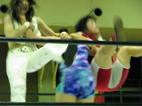 その後は大畠がドロップキックやボディアタックで攻めると悲恋もフロントキックやアンクルホールドで攻める。