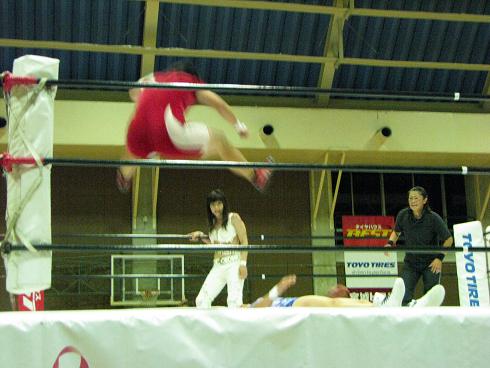 が、いつものチョップ連打は会場がプロレス観戦になれてない人ばかりだったのかあまり盛り上がらず。