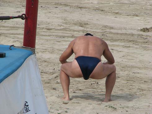 こちらにお尻を向けて砂浜でスクワットしてるサスケの股からは零れ落ちそうなほど立派なJrが(笑)
