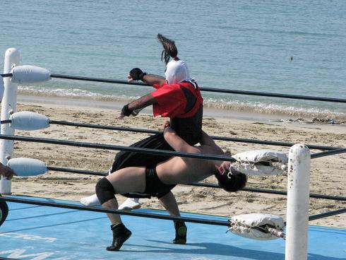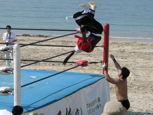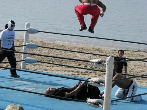最終的には波打ち際でのサンダー・ファイヤー・パワーボムからの卍固めでサスケ勝利。