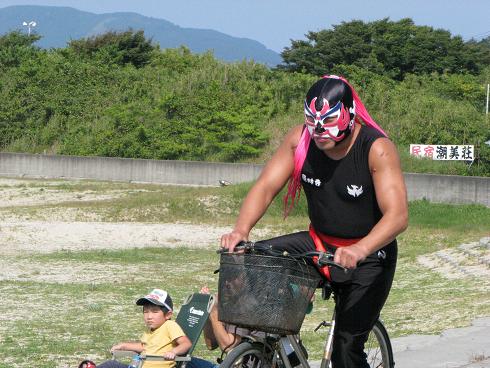 遅れて入場してきたと思ったら、リング付近に止めてあった自転車に乗り、リングサイドへ。