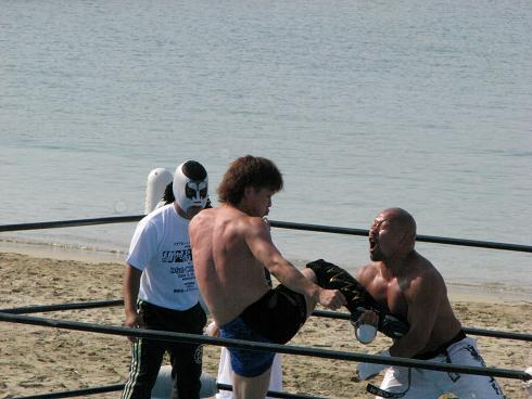 ハヤトと拳王の蹴り対決は砂浜という音響面ではかなりマイナスな状況でも関係無しに打撃音が観客の耳に届いてて、それだけ痛みが伝わっていい感じではあったけどね。
