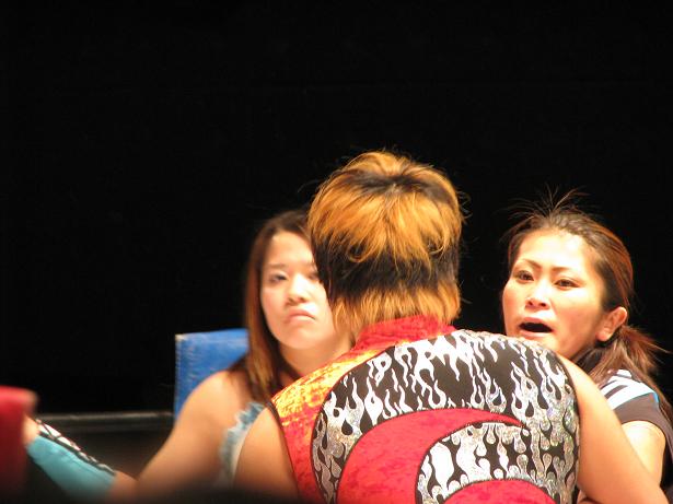 最後は里村の変形のスリーパーで日向が落ちたのか、TKOで決着。