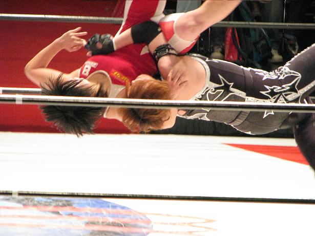 花月が里村へ腕ひしぎを仕掛けてるのをチサコがフットスタンプでアシスト、里村と華名のダブルのミドルキック等、結構見応えのある攻防。