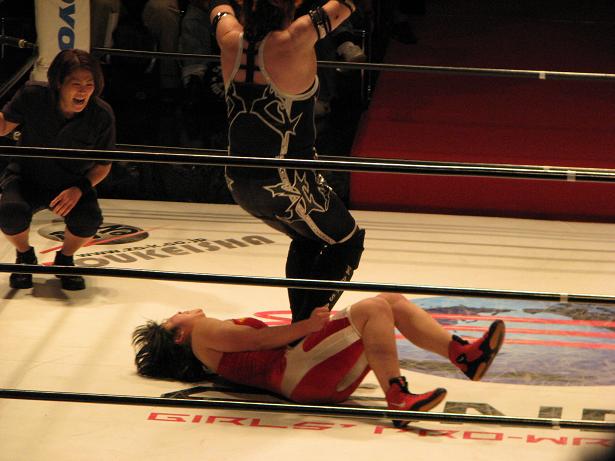 チサコのホルモンスプラッシュをカウント2で返した風香、ハイキックやジャーマン等で応戦。