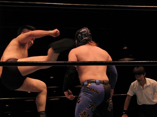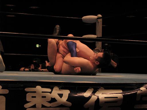 大地は若手なので基本的な技しか知らない(というか解禁されてないが正しいかも)ので、グラウンドの他はエルボーやドロップキック、ボディスラムで試合を構成。