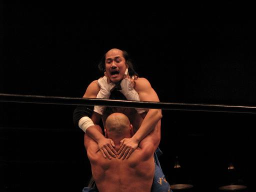 これがまた見事な攻防で、普段のチェーンレスリングならヘッドシザースはすぐ外してしまうのだけど、きっちり締め上げるところがなんとも渋い。