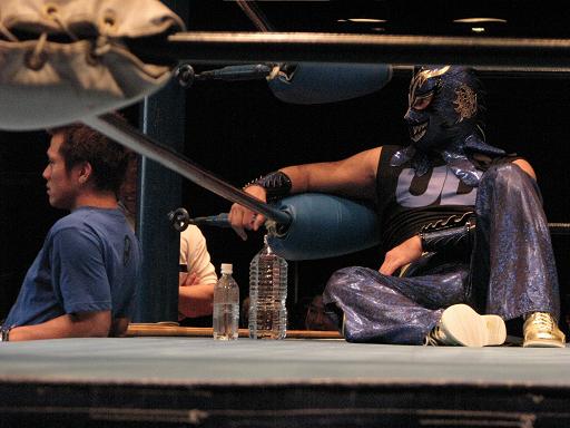 会場外にサスケが出れば当然佐藤兄弟も追って外に出るのだが、ウルティモはリング上でコーナーを背にくつろぐ。