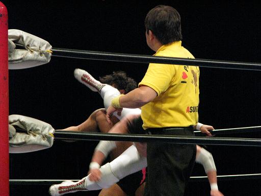 満を持してフォールに入るも和田レフェリーを巻き込むカットが入りかうんと3ならず。