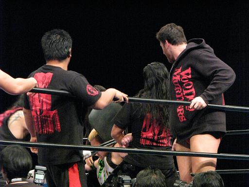 試合後、ブーイングの中リング上をVMが占拠。