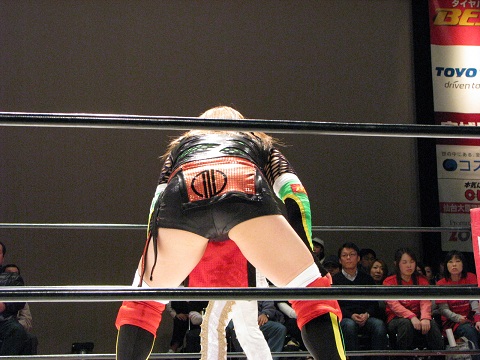 十文字姉妹は「竜虎の拳」のリー・パイロンのようなお面+仙台市の市章がお尻に入ったもの(なんていうか知らない)で登場。