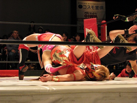 ならばと豊田がジャパニーズ・オーシャン・サイクロンスープレックスを出そうとするも、それを切り返す花月。