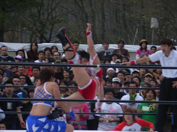 天野がタイガースープレックスを繰り出したり、カルロスゴーンを繰り出せば、里村もデスバレーやオーバーヘッドキックでお返し。