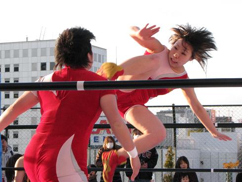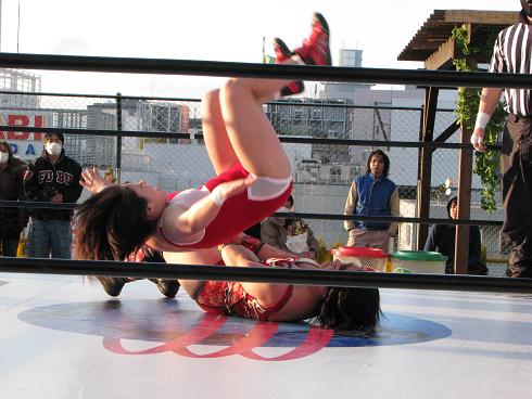 他にも幸子が里村にサンセットフリップを連発したりジャーマンで投げたり、水波が裏投げを連発したり、チサコが幸子を裏投げで投げようとしてたところをミサイルキックで阻止したりホルモン・スプラッシュ(名前がやっぱりダサいw)かましたり。